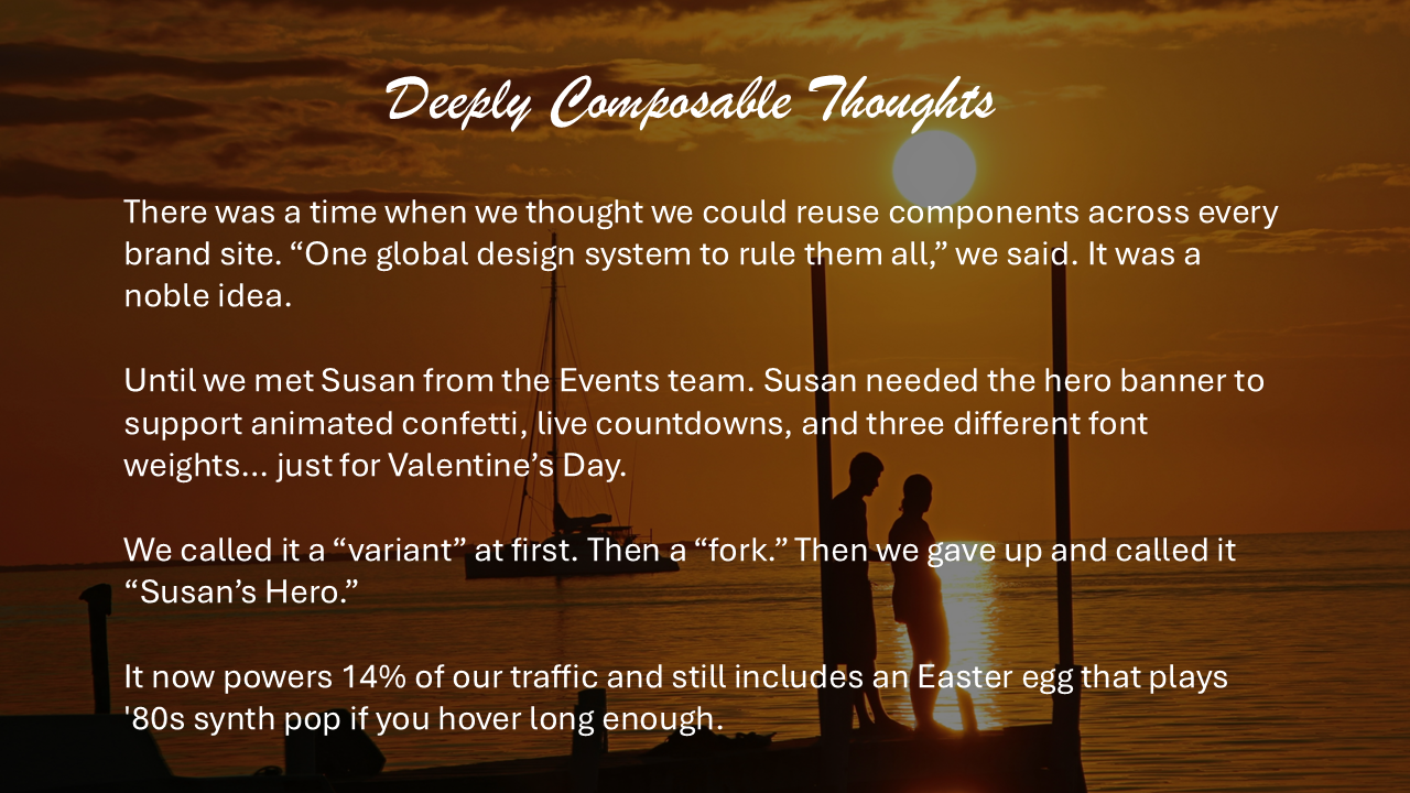 There was a time when we thought we could reuse components across every brand site. “One global design system to rule them all,” we said. It was a noble idea.